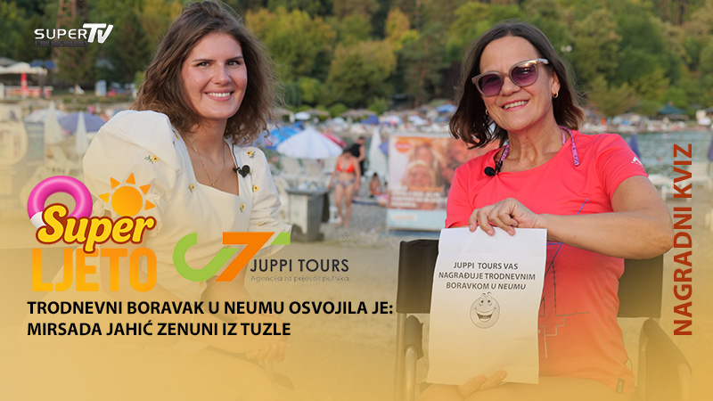Super TV donosi ljeto puno zabave, znanja i nagrada! U okviru popularnog serijala „Super ljeto“, ekipa Super TV-a i ovog puta donosi osmijehe i korisne savjete direktno s Panonskih jezera. U ovosedmičnoj emisiji, gledatelji su imali priliku čuti stručne preporuke za zdravlje od Irne Hanić, vlasnice kozmetičkog salona „Magic Hands“ iz Tuzle, te prof. dr. Mehe Alić Partića – dugogodišnjeg saradnika Super TV-a i predsjednika Udruženja za sport i zdravlje. Uz to, emitovana je reportaža iz Gračanice, snimljena tokom manifestacije oldtimer kluba „Gračanica“, gdje su se okupila vozila koja bude uspomene i strast vlasnika iz cijele regije. Kviz „Koliko poznaješ Tuzlu?“ bio je vrhunac emisije – takmičarka Mirsada Jahić Zenuni iz Tuzle briljirala je tačnim odgovorima na sva pitanja, a u dijelu „50-50 šansa“ imala je sreću i izvukla kovertu sa nagradom! Turistička agencija Juppi Tours obezbjedila je trodnevni boravak u Neumu! Juppi Tours priprema još iznenađenja za uspješne takmičare u narednim emisijama, pa pozivamo sve gledatelje da nas potraže na Panonskim jezerima, prijave se za kviz i podijele svoje doživljaje s ovog prelijepog lokaliteta. Dokumenti, podaci i informacije objavljeni na domeni supertv.ba/supertelevizija.com se mogu koristiti samo za individualne potrebe korisnika, uz poštivanje svih autorskih i vlasničkih prava te prava trećih osoba. Super TV polaže autorska prava na sve vlastite sadržaje (tekstualne, vizualne i audio materijale, baze podataka i programski kod). Neovlašteno korištenje bilo kojeg dijela domene smatra se kršenjem autorskih prava, i može rezultirati sudskim i drugim postupcima protiv prekršitelja. (SUPER TV)